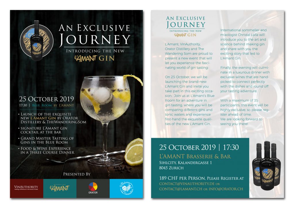 L’Amant, VinAuthority, Orator Distillery und The Wandering Sommelier haben zusammengearbeitet um diesen exklusiven neuen Gin zu kreieren – und wir möchten Sie einladen, bei dieser aufregenden Gelegenheit dabei zu sein! Überzeugen Sie sich selbst von den exquisiten Eigenschaften dieses neuen Gins und erleben Sie einen Abend, der Gin, gute Weine und ausgezeichnetes Essen umfasst.