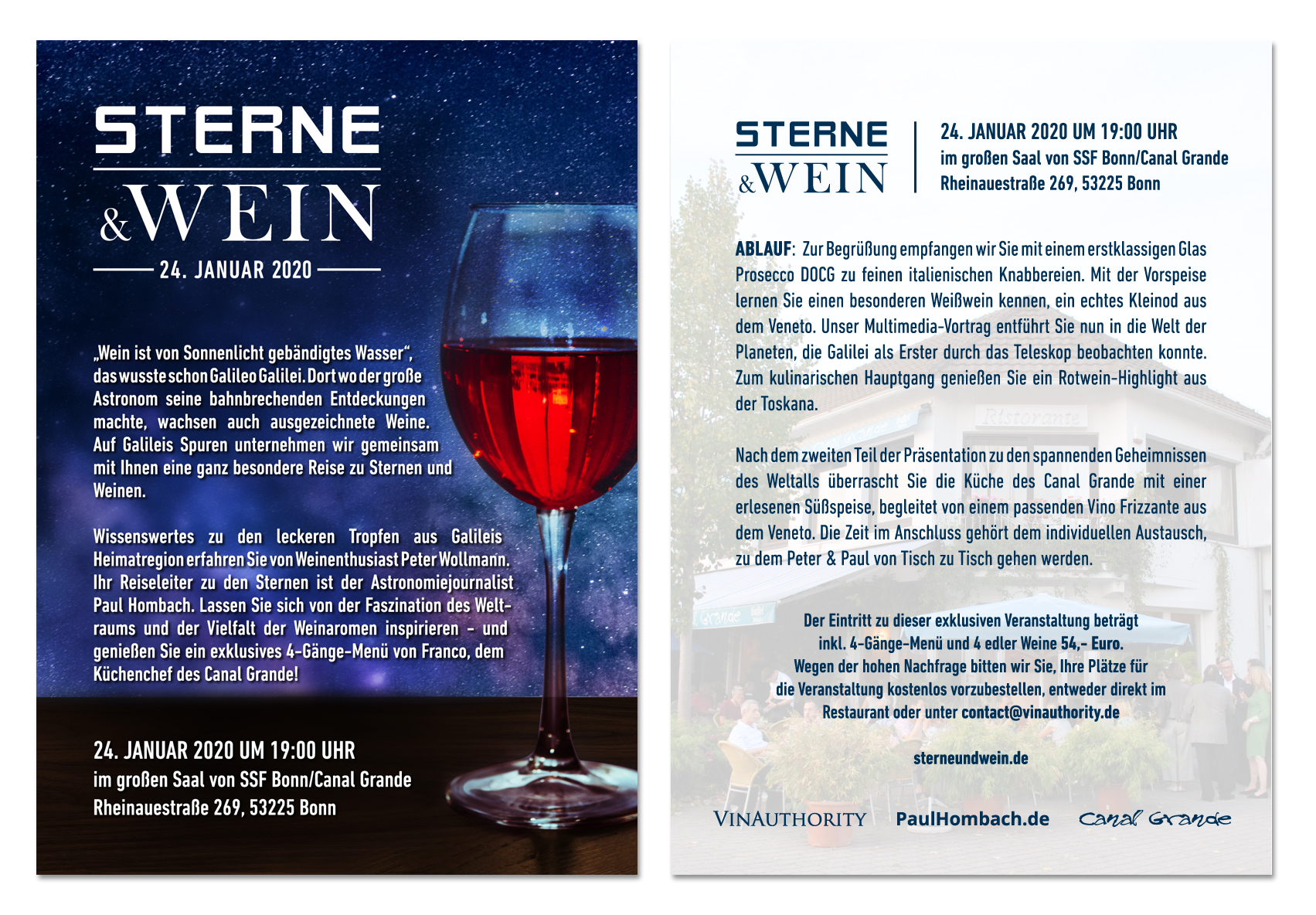 Wissenswertes zu den leckeren Tropfen aus Galileis Heimatregion erfahren Sie von Weinenthusiast Peter Wollmann. Ihr Reiseleiter zu den Sternen ist der Astronomiejournalist Paul Hombach. Lassen Sie sich von der Faszination des Weltraums und der Vielfalt der Weinaromen inspirieren – und genießen Sie ein exklusives 4-Gänge-Menü von Franco, dem Küchenchef des Canal Grande!